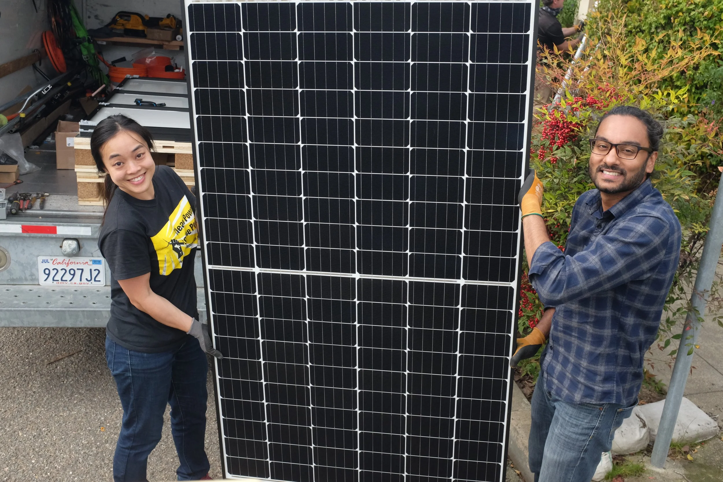 People Power Solar Collaborative team members installing solar panels on a home in Oakland. PBEB can help fund more projects like this.